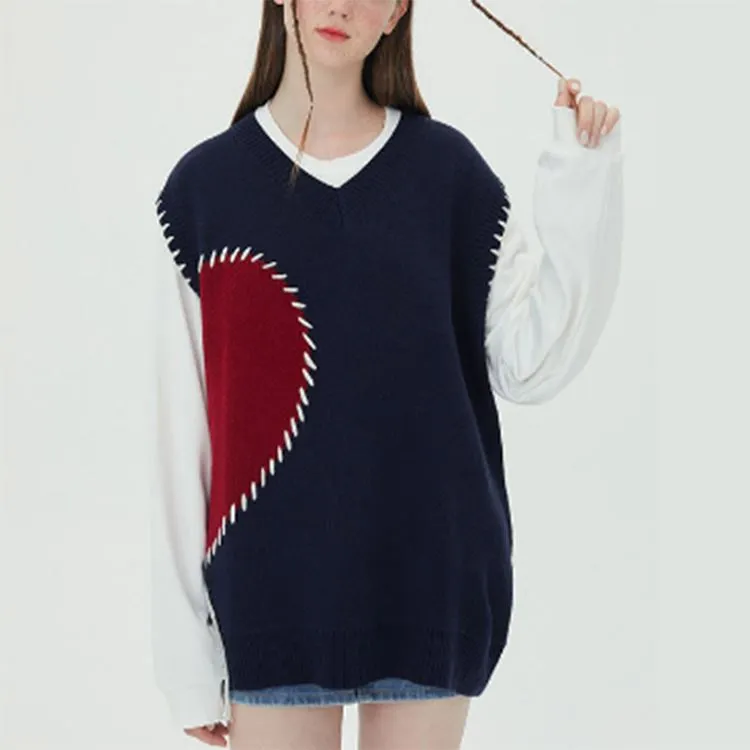 Punt de coll en V jersei de gran mida colors contrastats tops de dona de punt en forma de cor-roba de punt suau i lleugera, jersei de punt superior de moda de color contrastat. rentar amb aigua freda / No blanquejar / Assecar la línia / Rentar amb colors similars Tops sense mànigues de punt de jacquard d'alt nivell de qualitat. enviament directe.-Procés de gamma alta.